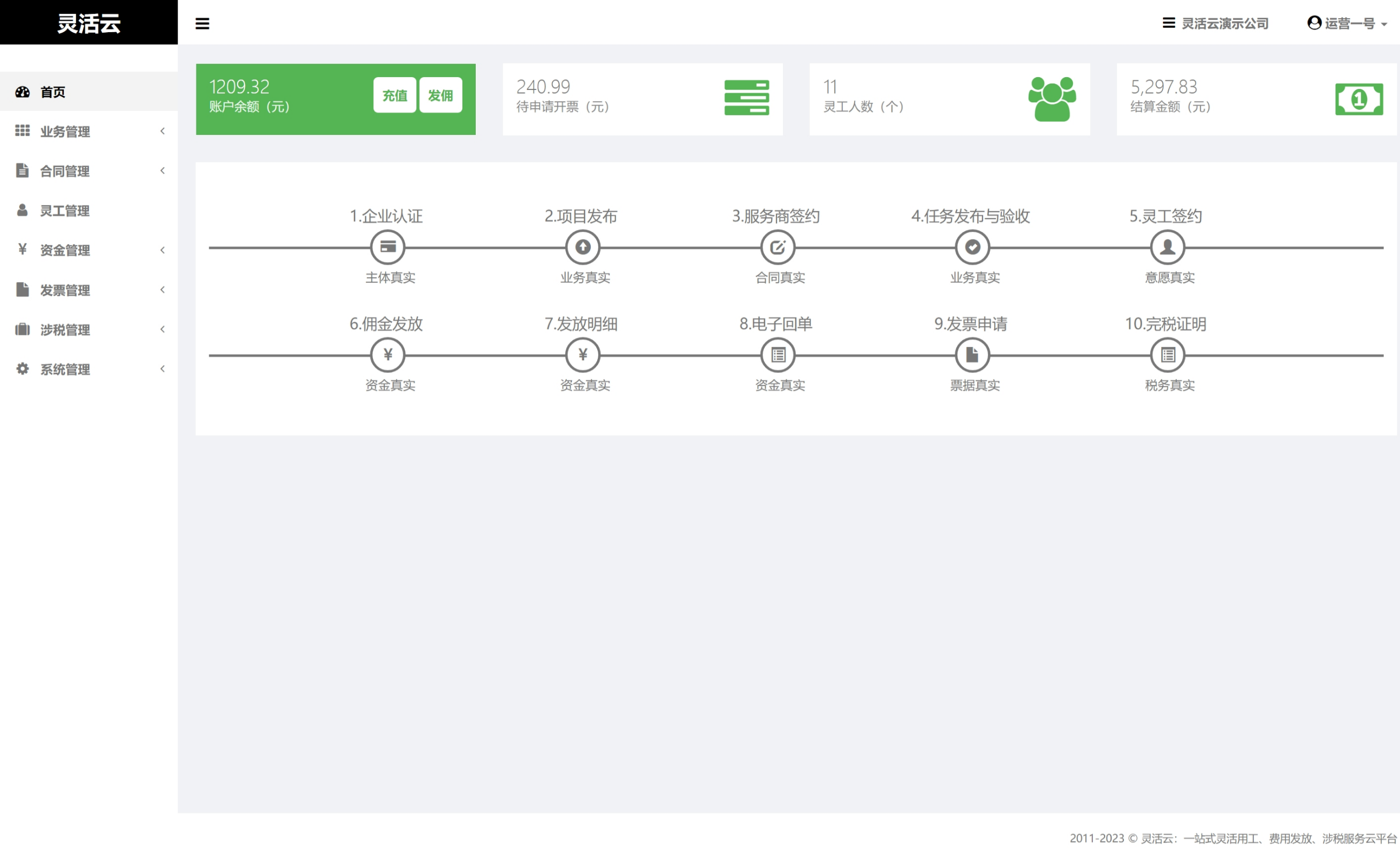 企业使用灵活云SAAS服务平台,一站式完成任务订单发布、智能派单、费用结算、批量支付等全流程操作。平台具备实名信息采集、个人信息实名验证、平台交易、资金流向、合同管理、发票管理、缴税记录等功能,实现灵活用工业务全场景、交易环节全流程的记录展示,确保业务真实、四流合一。